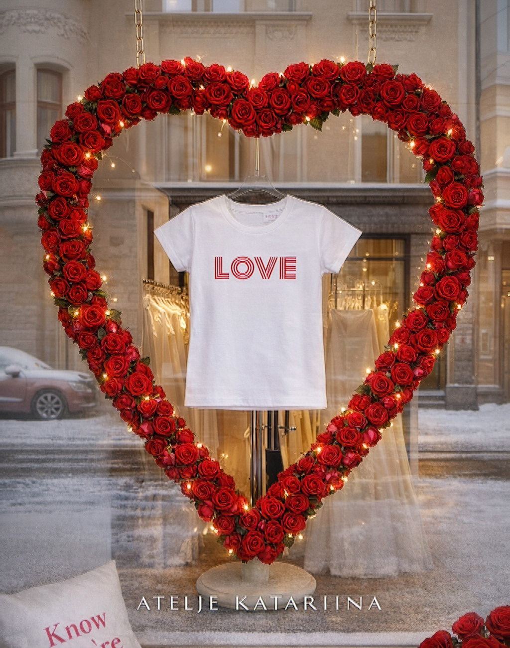 Toteutimme Ateljé Katariinalle myyntitiskin logoineen, henkilökunnalle räätälöidyt t-paidat sekä näyttävän ruusuinstallaation näyteikkunaan.