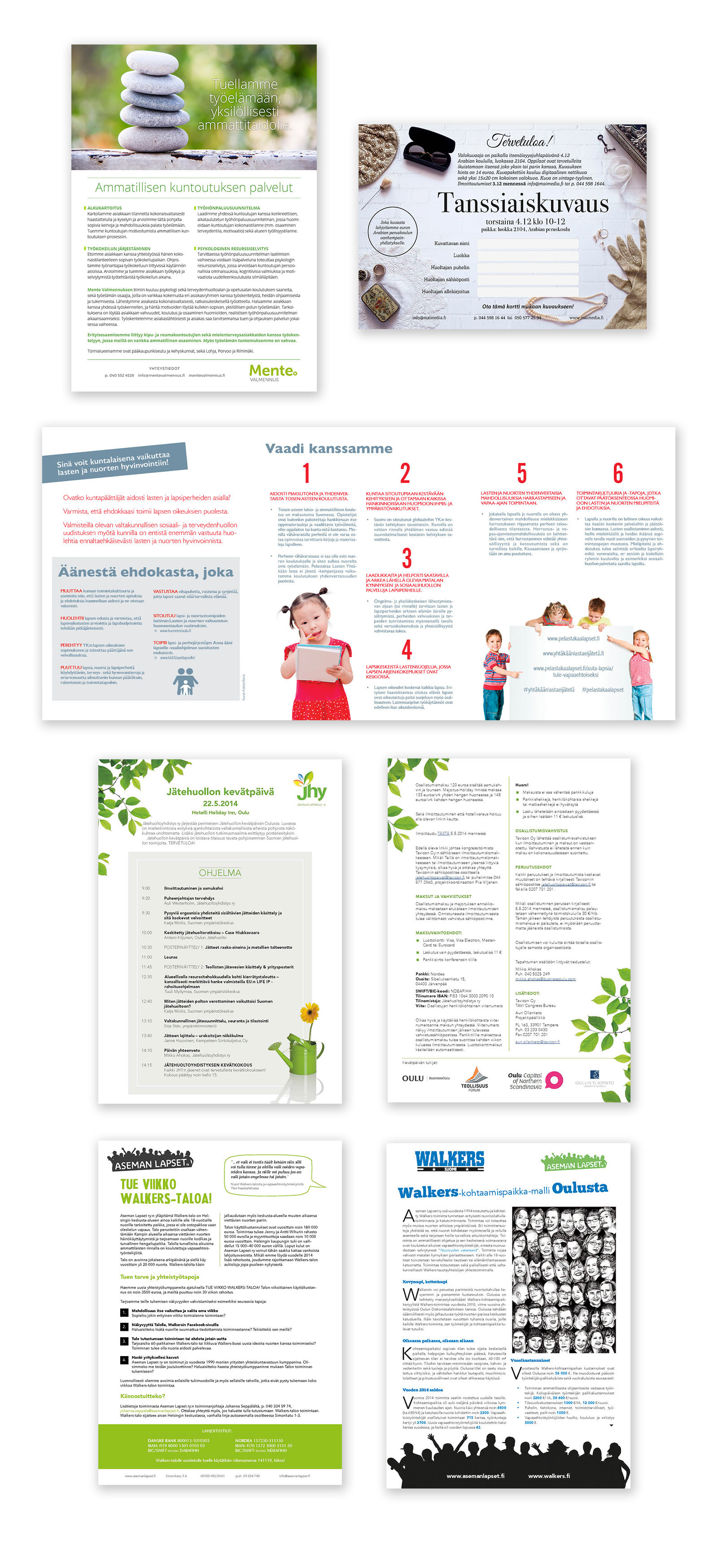 Taittamiamme pieniä esitteitä ja flyereita eri organisaatioille.