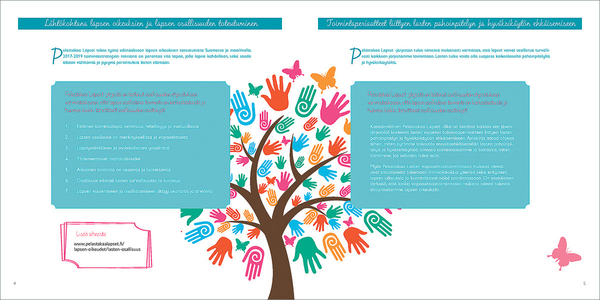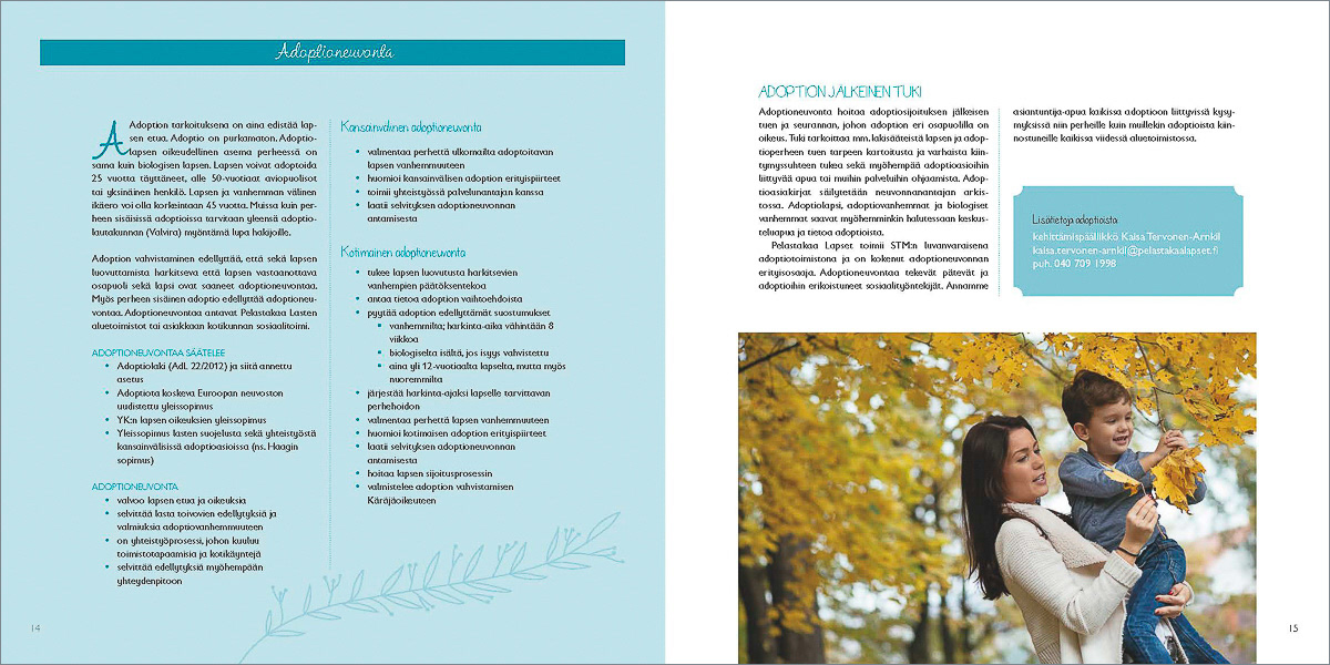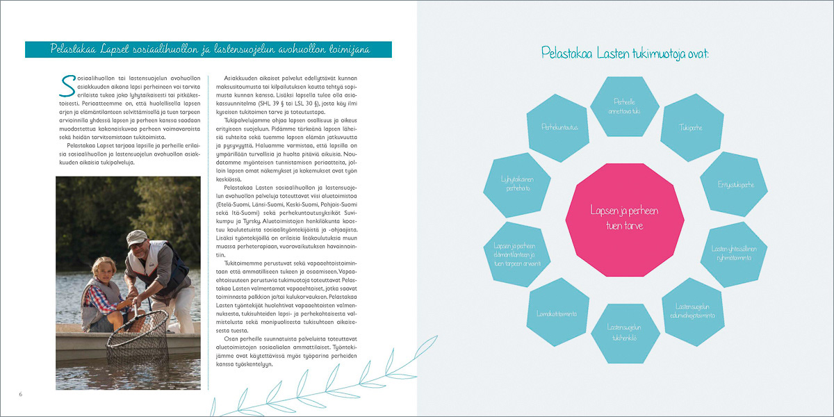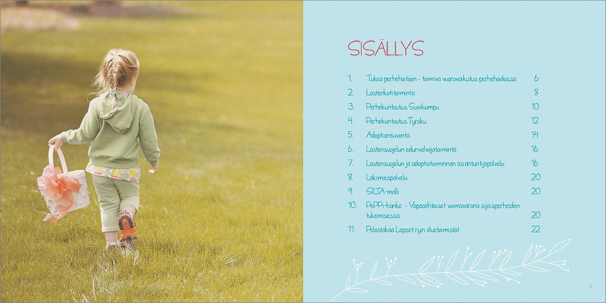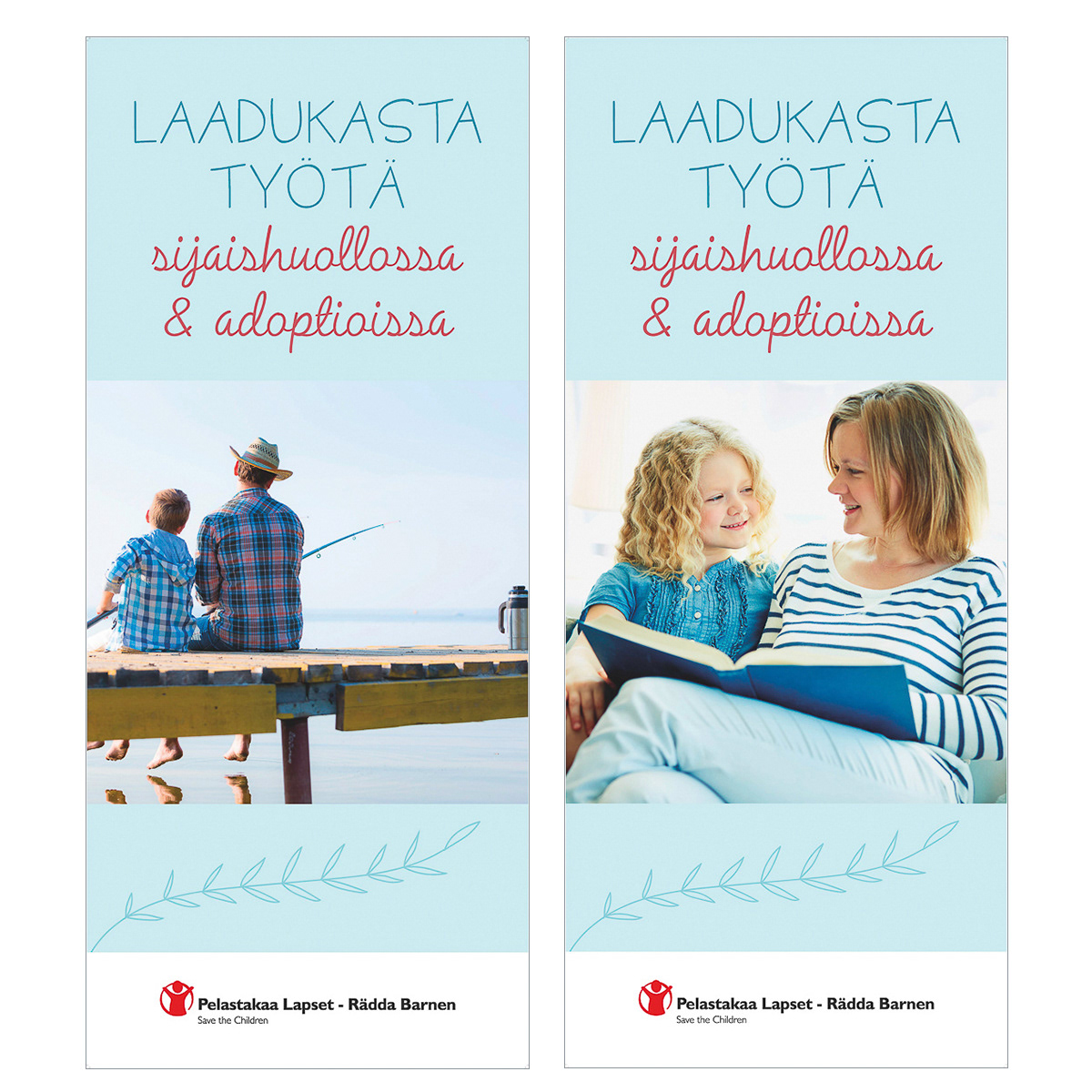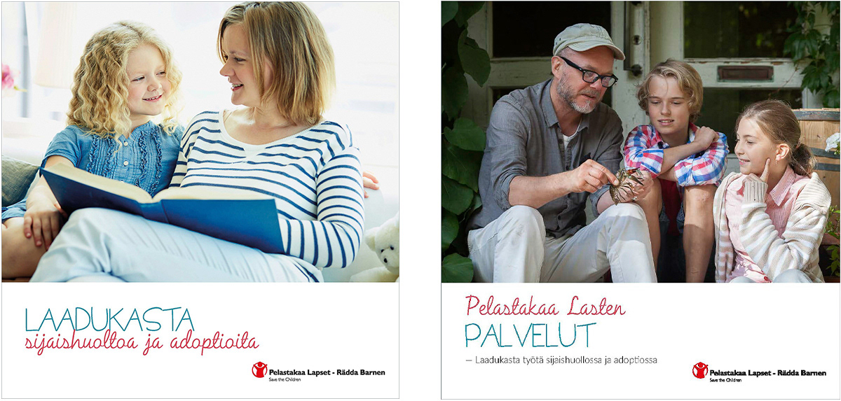 Pelastakaa Lasten lastensuojelupalveluista kertoville esitteille ja julisteille haluttiin lempeä ja raikas ilme. Katriina Roiha kuvasi perhe- ja lapsiaiheisia kuvia projektiin ja Heidi suunnitteli painotuotteiden ulkoasun ja taittoi materiaalit.